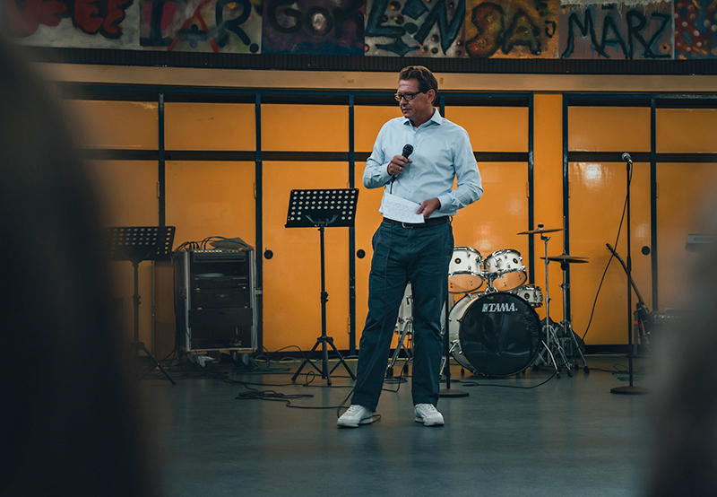Mit dem Willkommenslied, das die Sechst- und Siebtklässler mithilfe der Lehrerband für die Kleinen sangen, und der Begrüßungsansprache des Schulleiters, Herrn Kaspari, brach das Eis bei den Fünftklässlern und auch die grauen Wolken wichen nun der Sonne und schönstem Spätsommer-Wetter.
